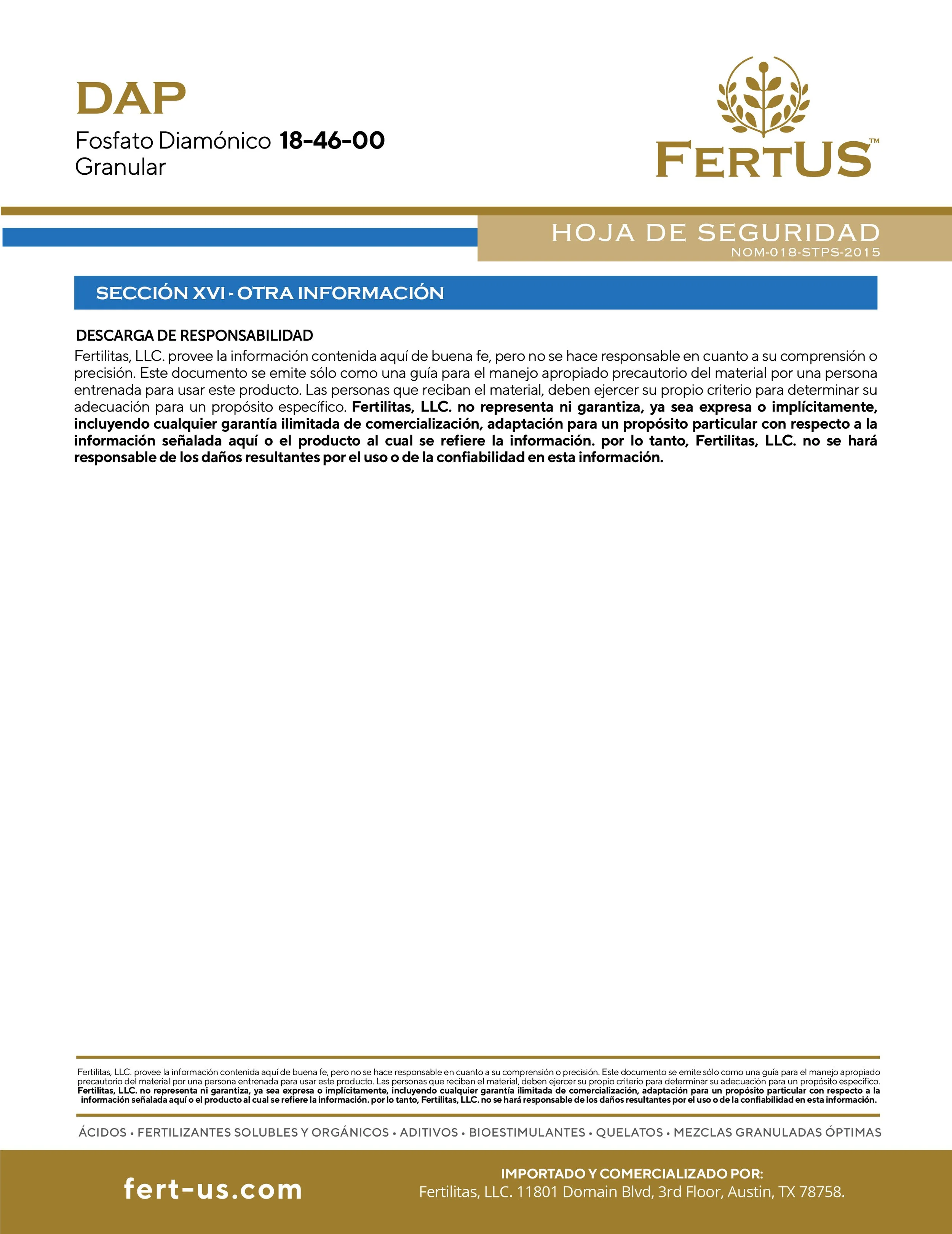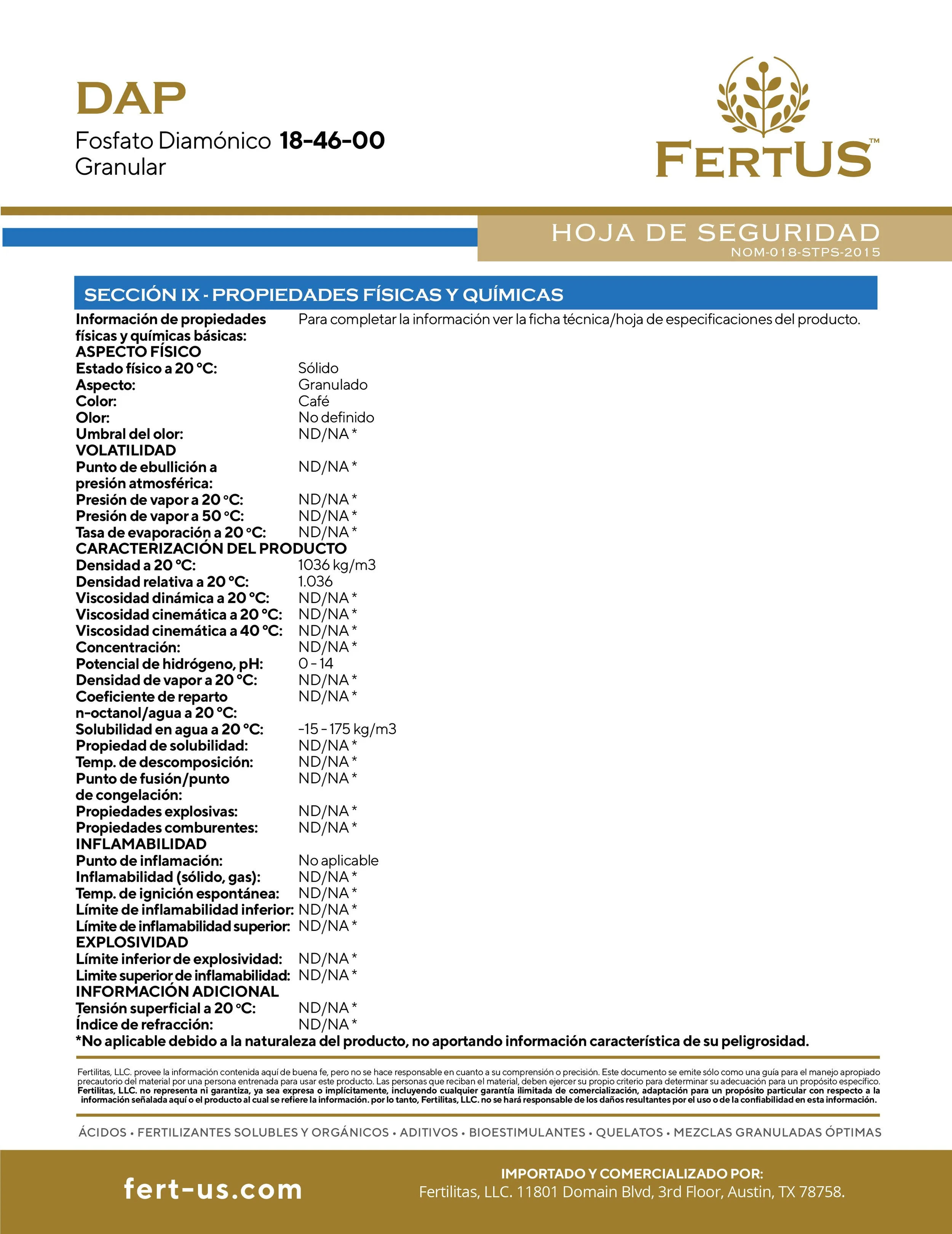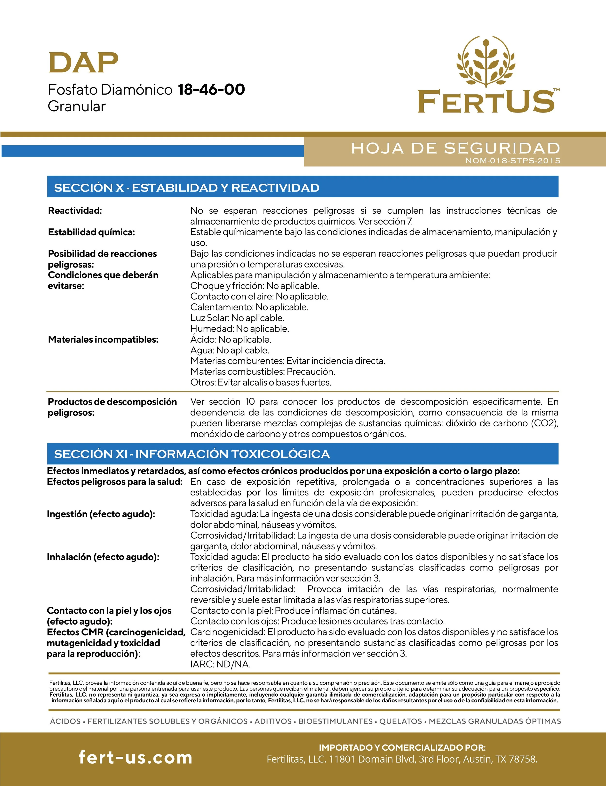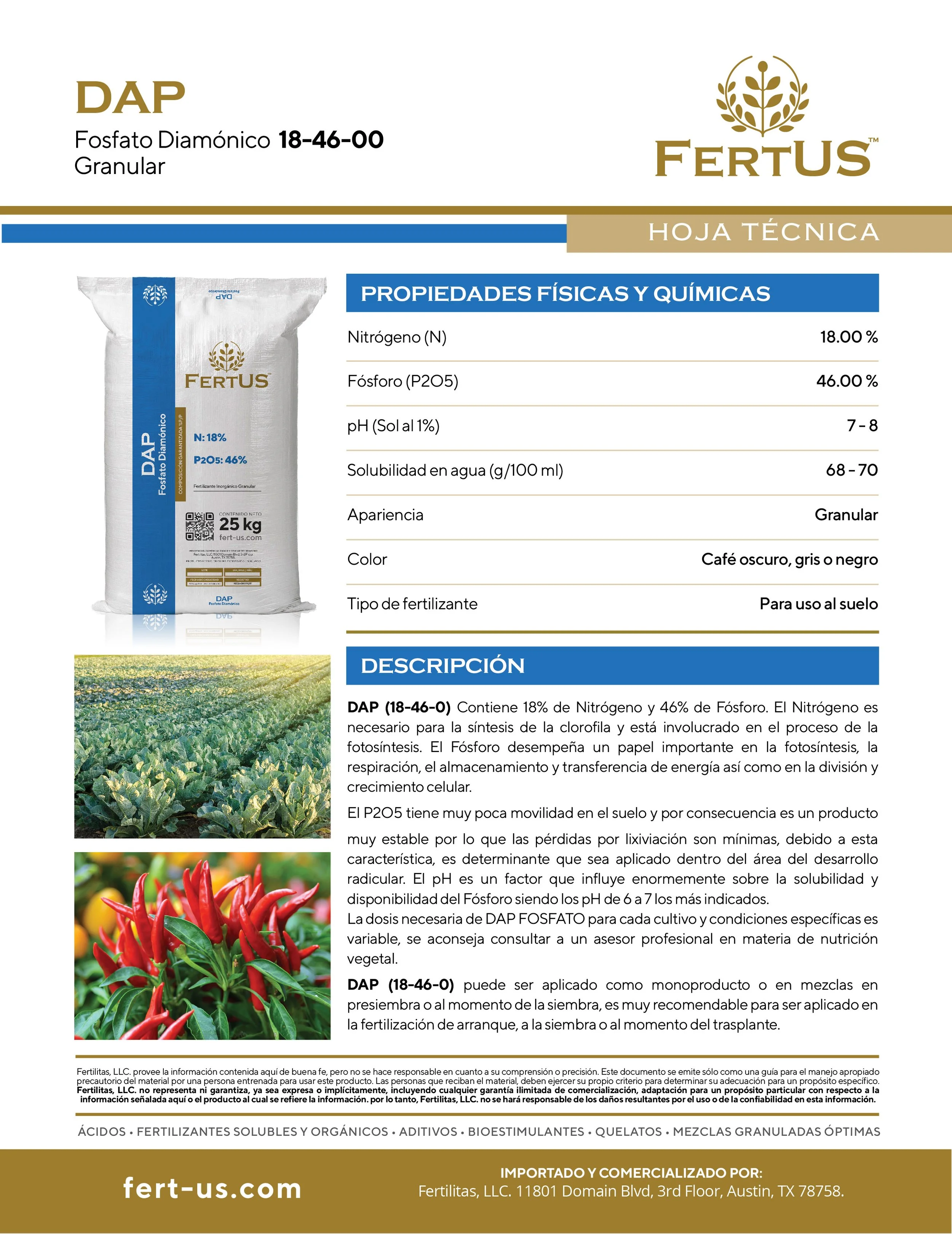 DAP (18-46-0) Contiene 18% de Nitrógeno y 46% de Fósforo. El Nitrógeno es necesario para la síntesis de la clorofila y está involucrado en el proceso de la fotosíntesis. El Fósforo desempeña un papel importante en la fotosíntesis, la respiración, el almacenamiento y transferencia de energía así como en la división y crecimiento celular. El P2O5 tiene muy poca movilidad en el suelo y por consecuencia es un producto muy estable por lo que las pérdidas por lixiviación son mínimas, debido a esta característica, es determinante que sea aplicado dentro del área del desarrollo radicular. El pH es un factor que influye enormemente sobre la solubilidad y disponibilidad del Fósforo siendo los pH de 6 a 7 los más indicados. La dosis necesaria de DAP FOSFATO para cada cultivo y condiciones específicas es variable, se aconseja consultar a un asesor profesional en materia de nutrición vegetal.