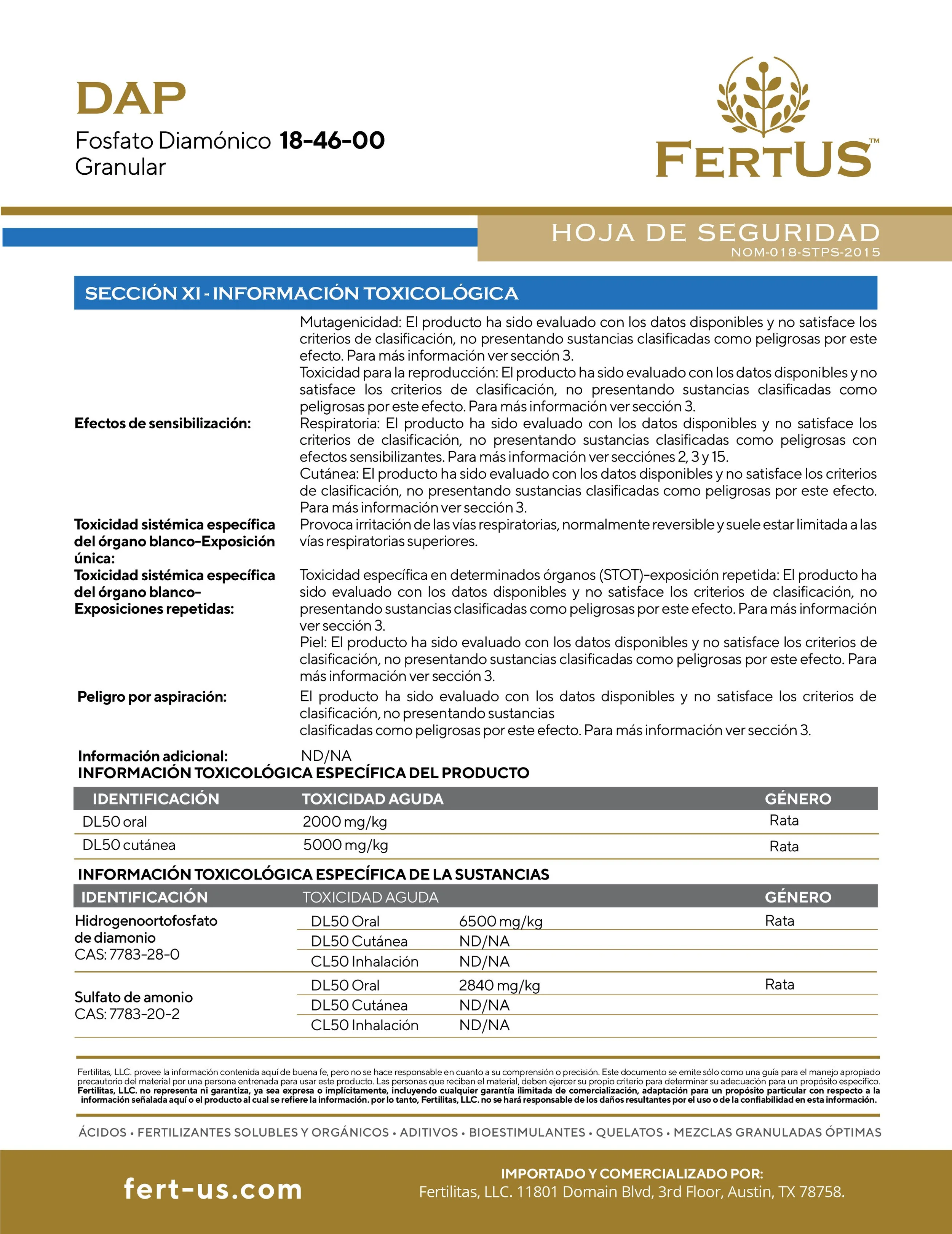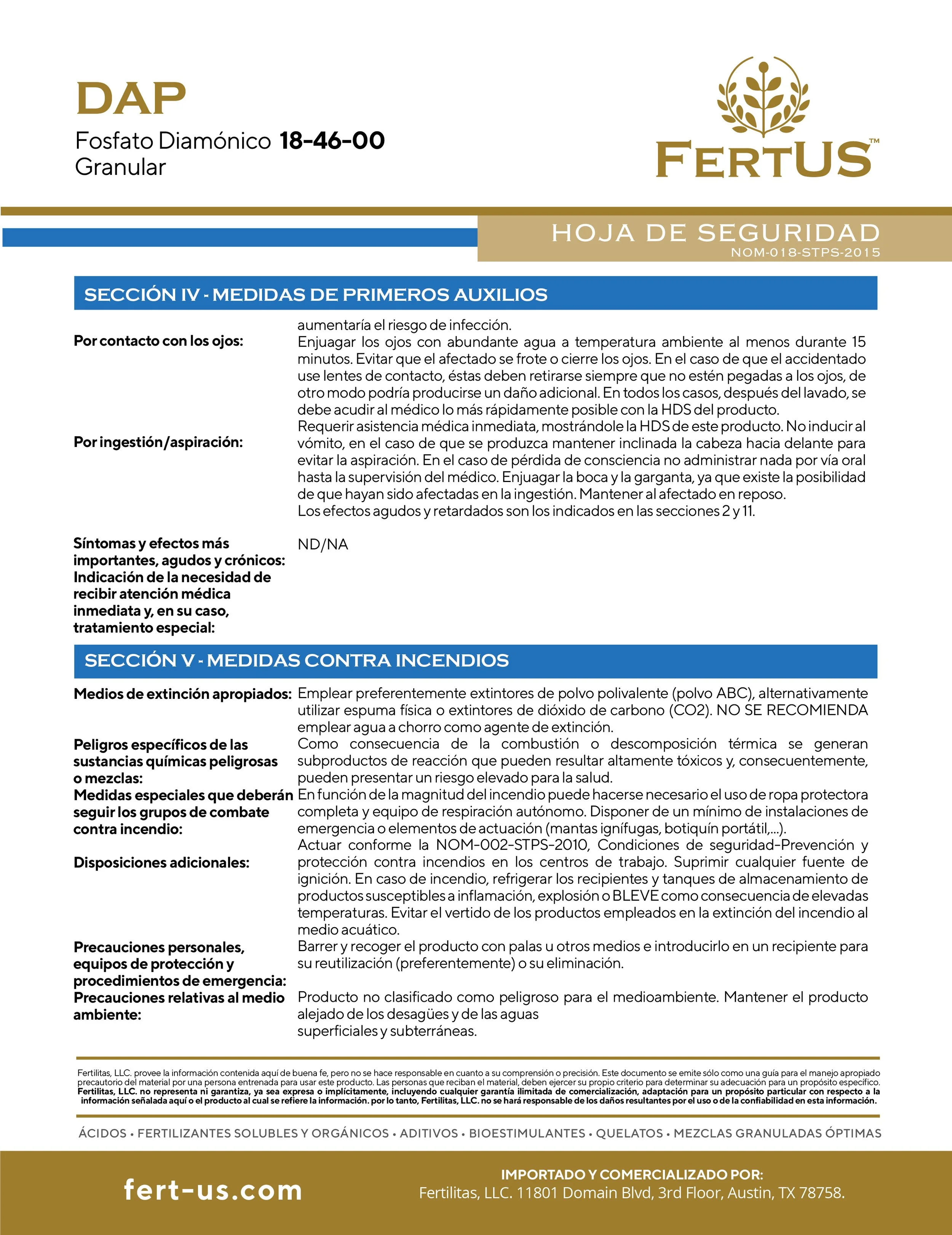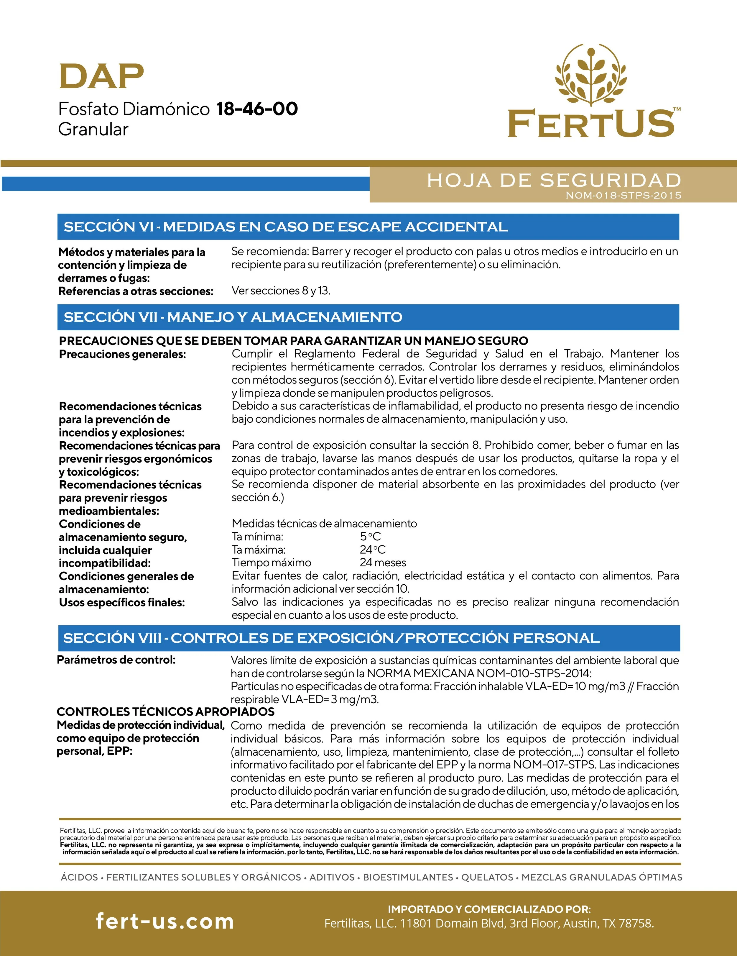 DAP (18-46-0) Contiene 18% de Nitrógeno y 46% de Fósforo. El Nitrógeno es necesario para la síntesis de la clorofila y está involucrado en el proceso de la fotosíntesis. El Fósforo desempeña un papel importante en la fotosíntesis, la respiración, el almacenamiento y transferencia de energía así como en la división y crecimiento celular. El P2O5 tiene muy poca movilidad en el suelo y por consecuencia es un producto muy estable por lo que las pérdidas por lixiviación son mínimas, debido a esta característica, es determinante que sea aplicado dentro del área del desarrollo radicular. El pH es un factor que influye enormemente sobre la solubilidad y disponibilidad del Fósforo siendo los pH de 6 a 7 los más indicados. La dosis necesaria de DAP FOSFATO para cada cultivo y condiciones específicas es variable, se aconseja consultar a un asesor profesional en materia de nutrición vegetal.