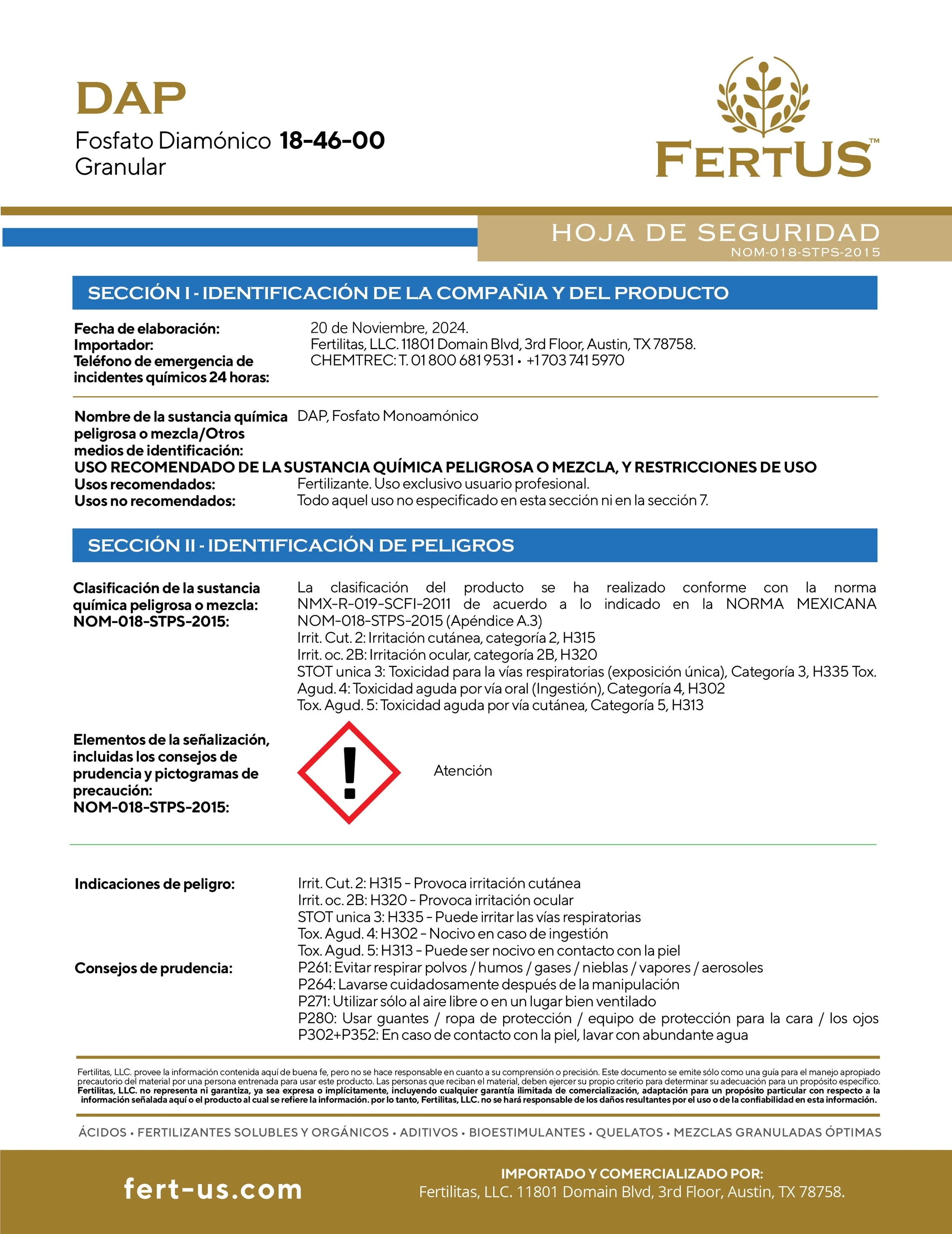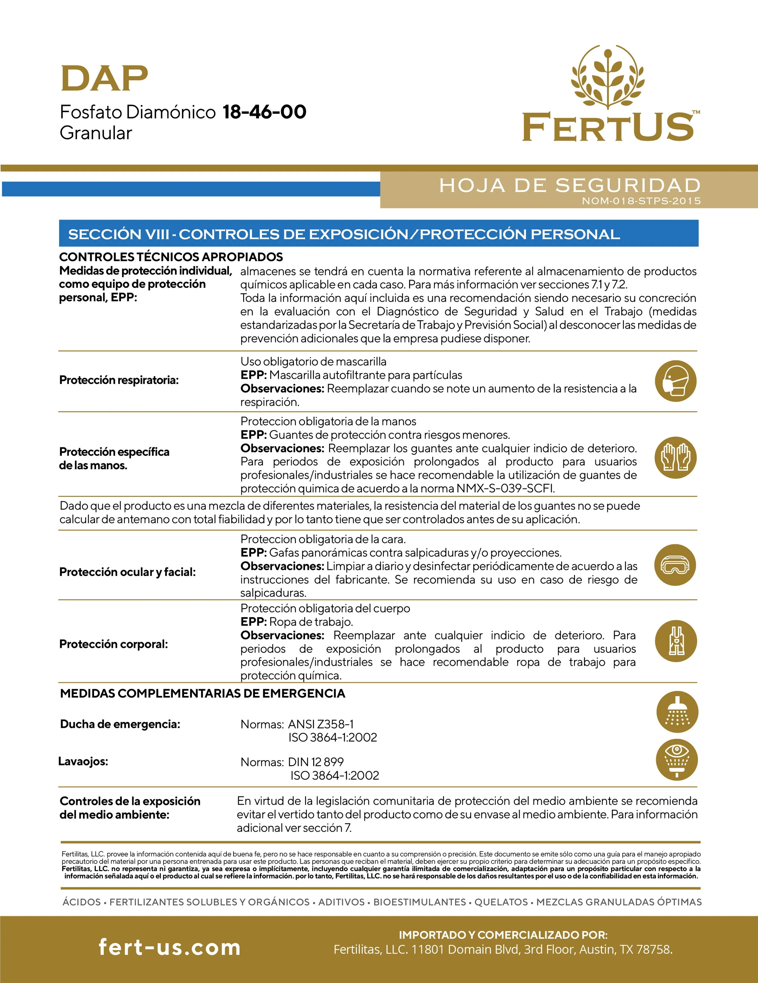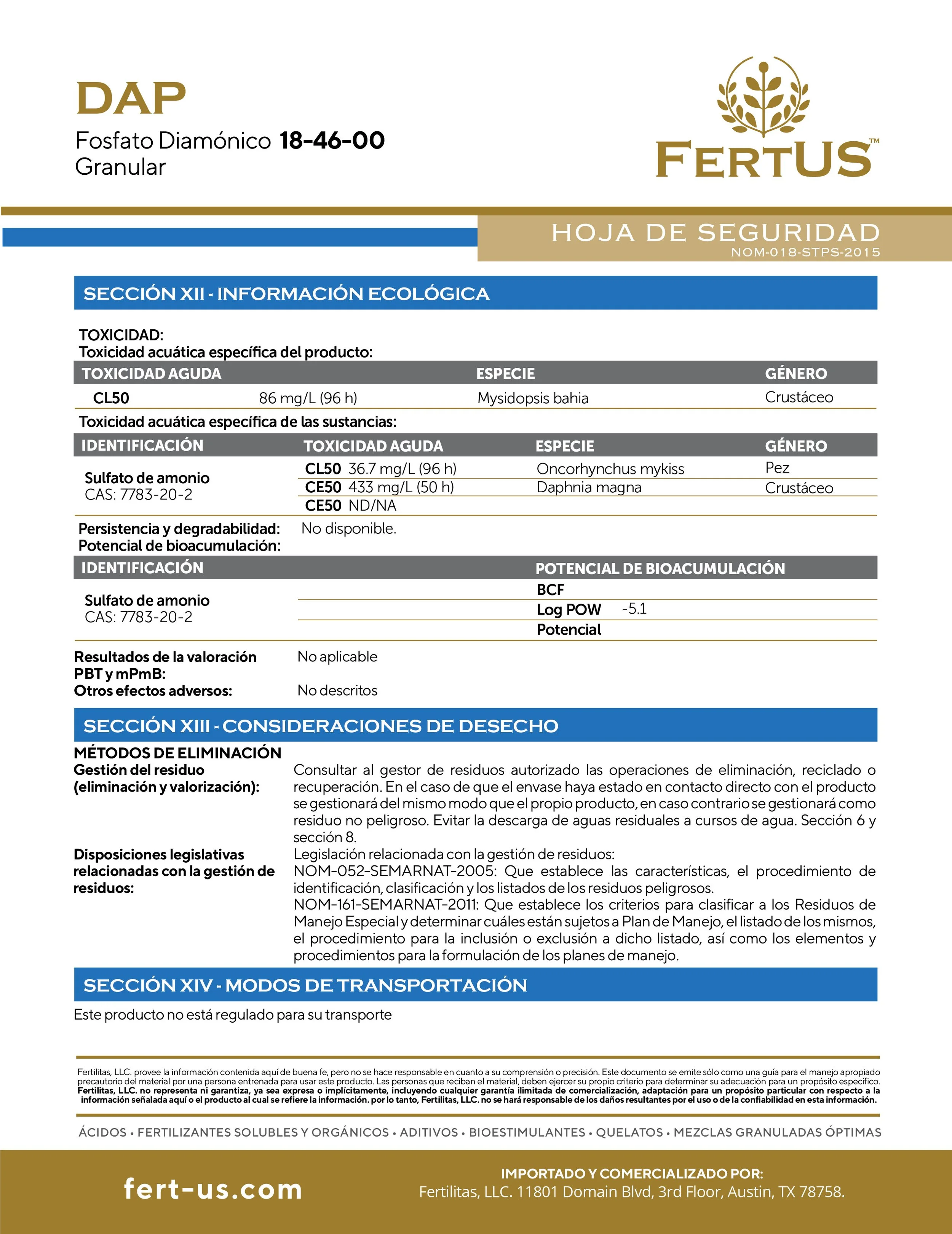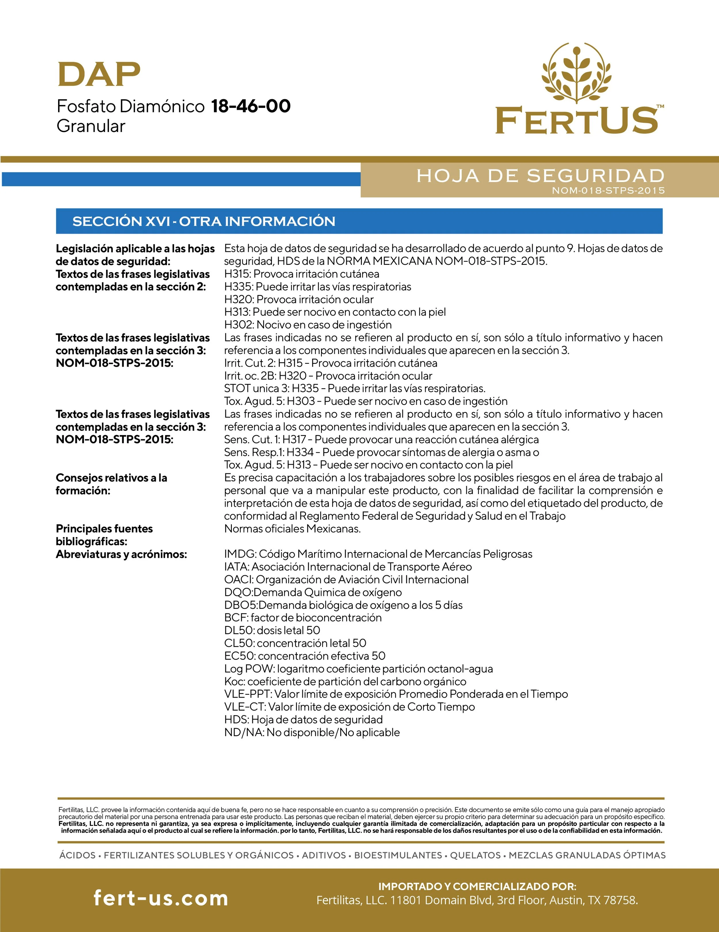DAP (18-46-0) Contiene 18% de Nitrógeno y 46% de Fósforo. El Nitrógeno es necesario para la síntesis de la clorofila y está involucrado en el proceso de la fotosíntesis. El Fósforo desempeña un papel importante en la fotosíntesis, la respiración, el almacenamiento y transferencia de energía así como en la división y crecimiento celular. El P2O5 tiene muy poca movilidad en el suelo y por consecuencia es un producto muy estable por lo que las pérdidas por lixiviación son mínimas, debido a esta característica, es determinante que sea aplicado dentro del área del desarrollo radicular. El pH es un factor que influye enormemente sobre la solubilidad y disponibilidad del Fósforo siendo los pH de 6 a 7 los más indicados. La dosis necesaria de DAP FOSFATO para cada cultivo y condiciones específicas es variable, se aconseja consultar a un asesor profesional en materia de nutrición vegetal.
