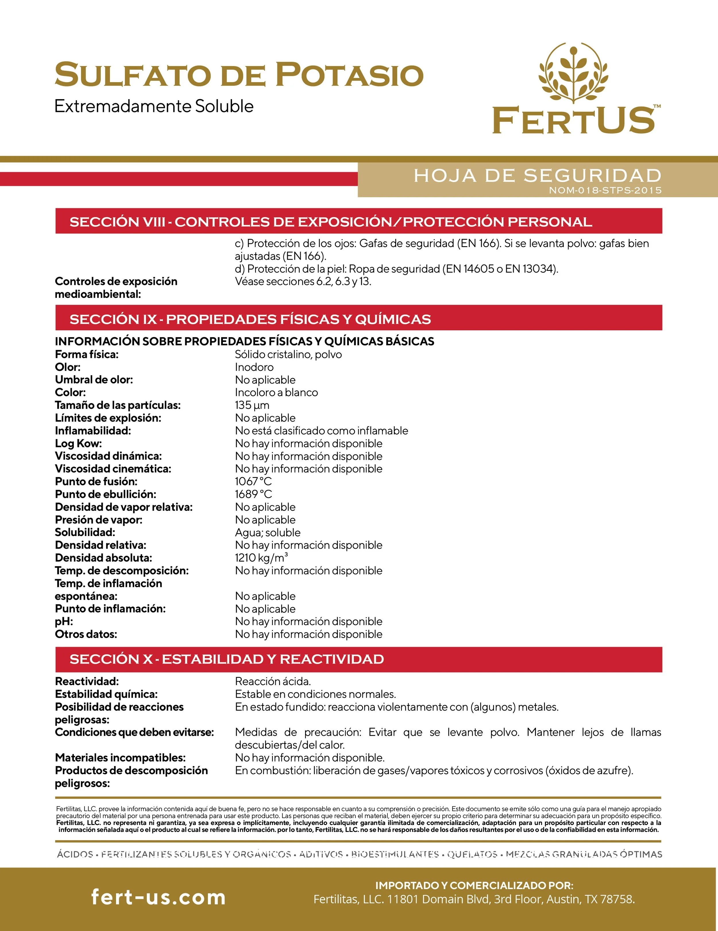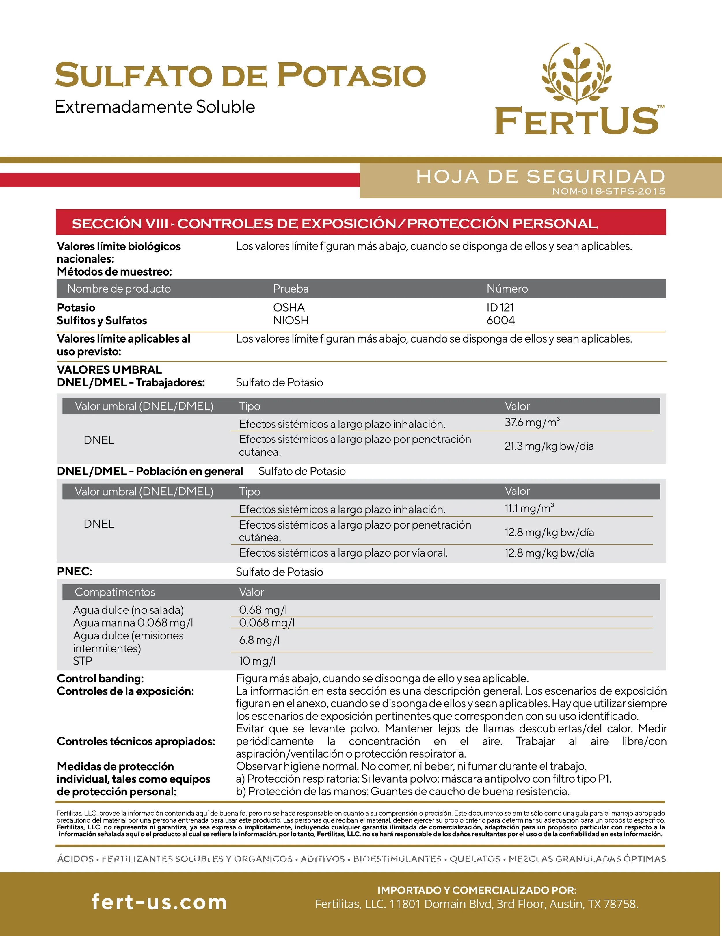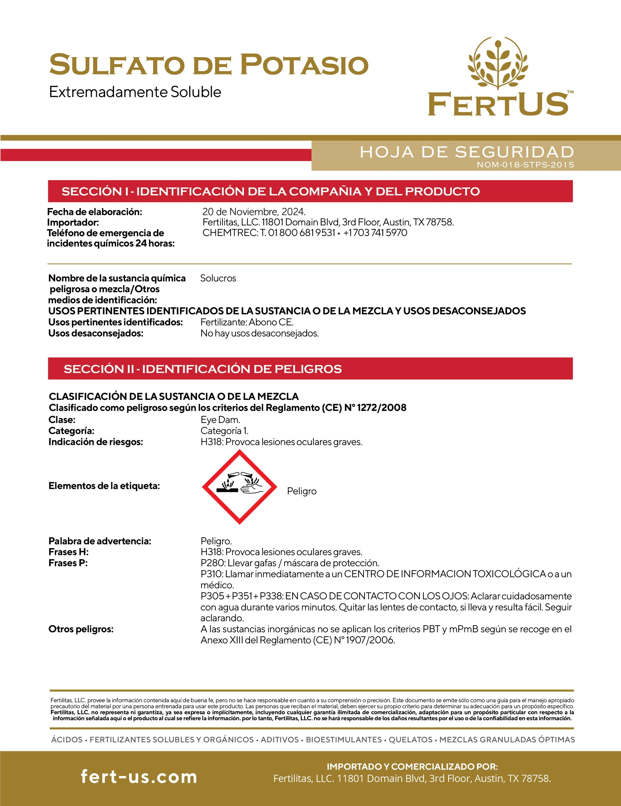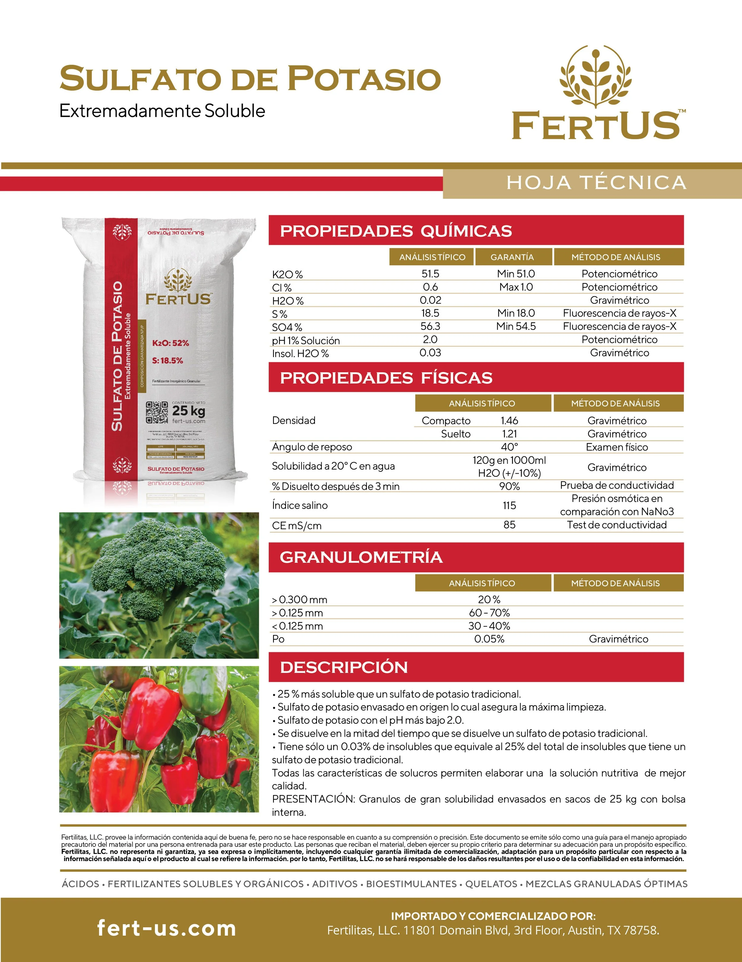 Extremandamente Soluble. 25 % más soluble que un sulfato de potasio tradicional. Sulfato de potasio envasado en origen lo cual asegura la máxima limpieza. Sulfato de potasio con el pH más bajo 2.0. Se disuelve en la mitad del tiempo que se disuelve un sulfato de potasio tradicional. Tiene sólo un 0.03% de insolubles que equivale al 25% del total de insolubles que tiene un sulfato de potasio tradicional. Todas las características de solucros permiten elaborar una la solución nutritiva de mejor calidad. PRESENTACIÓN: Granulos de gran solubilidad envasados en sacos de 25 kg con bolsa interna.