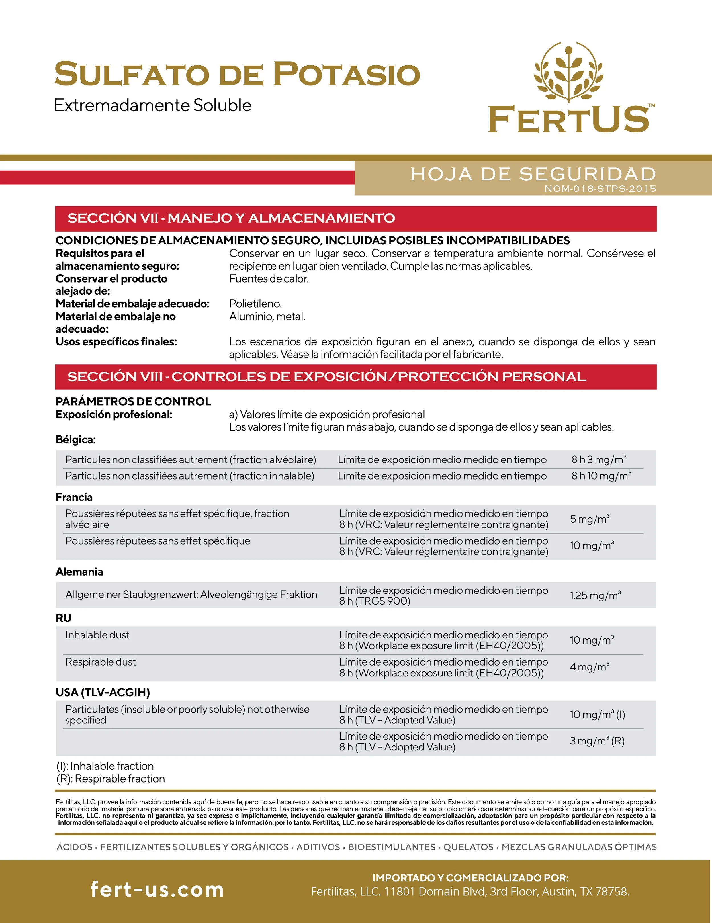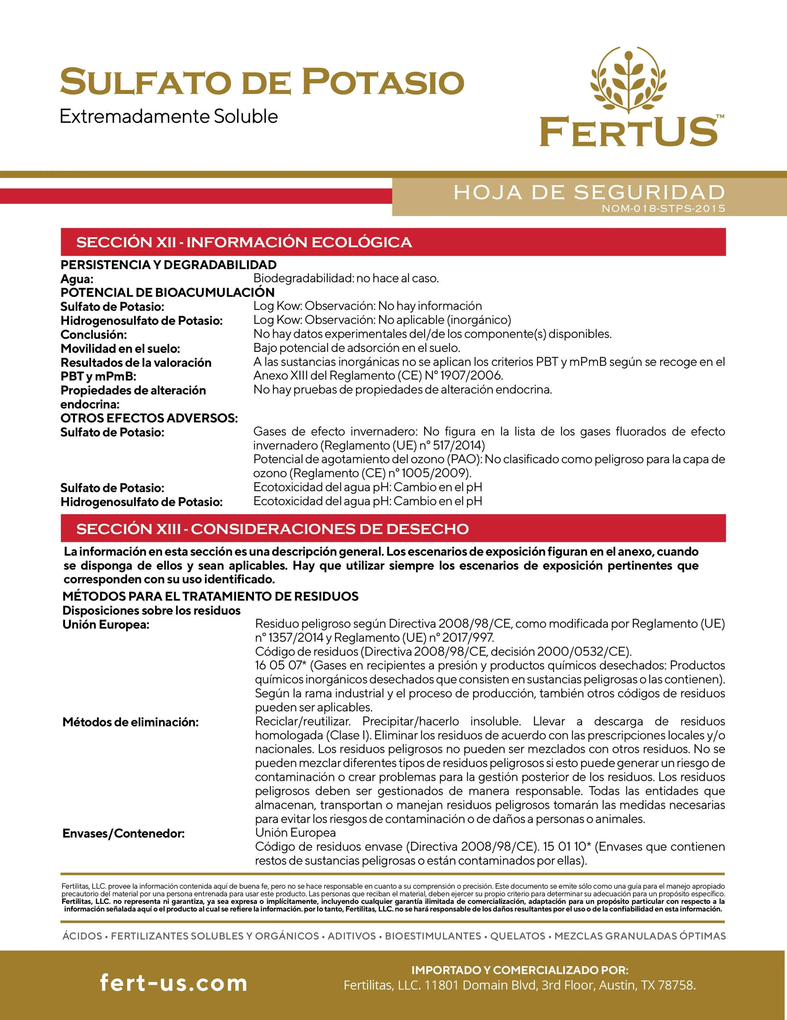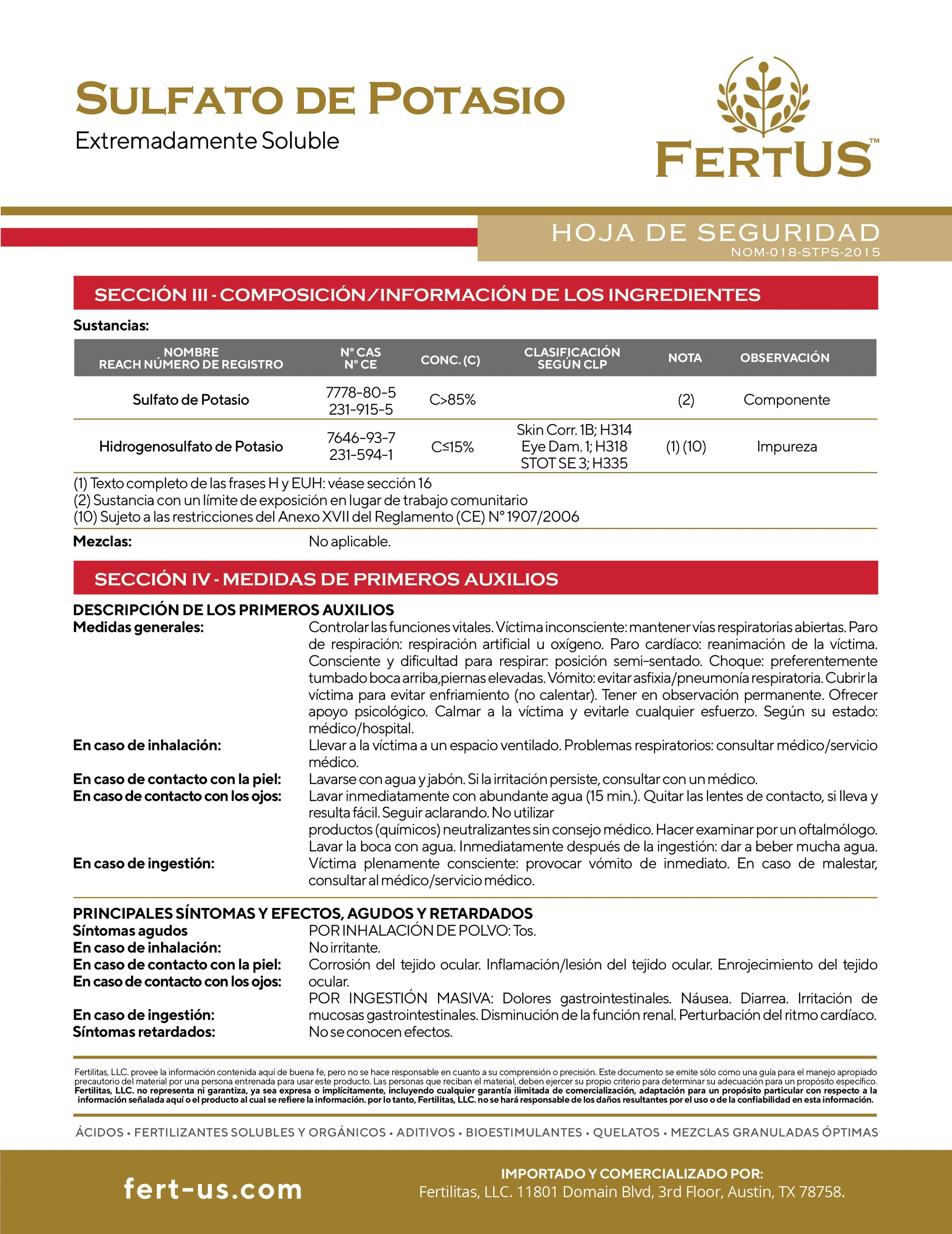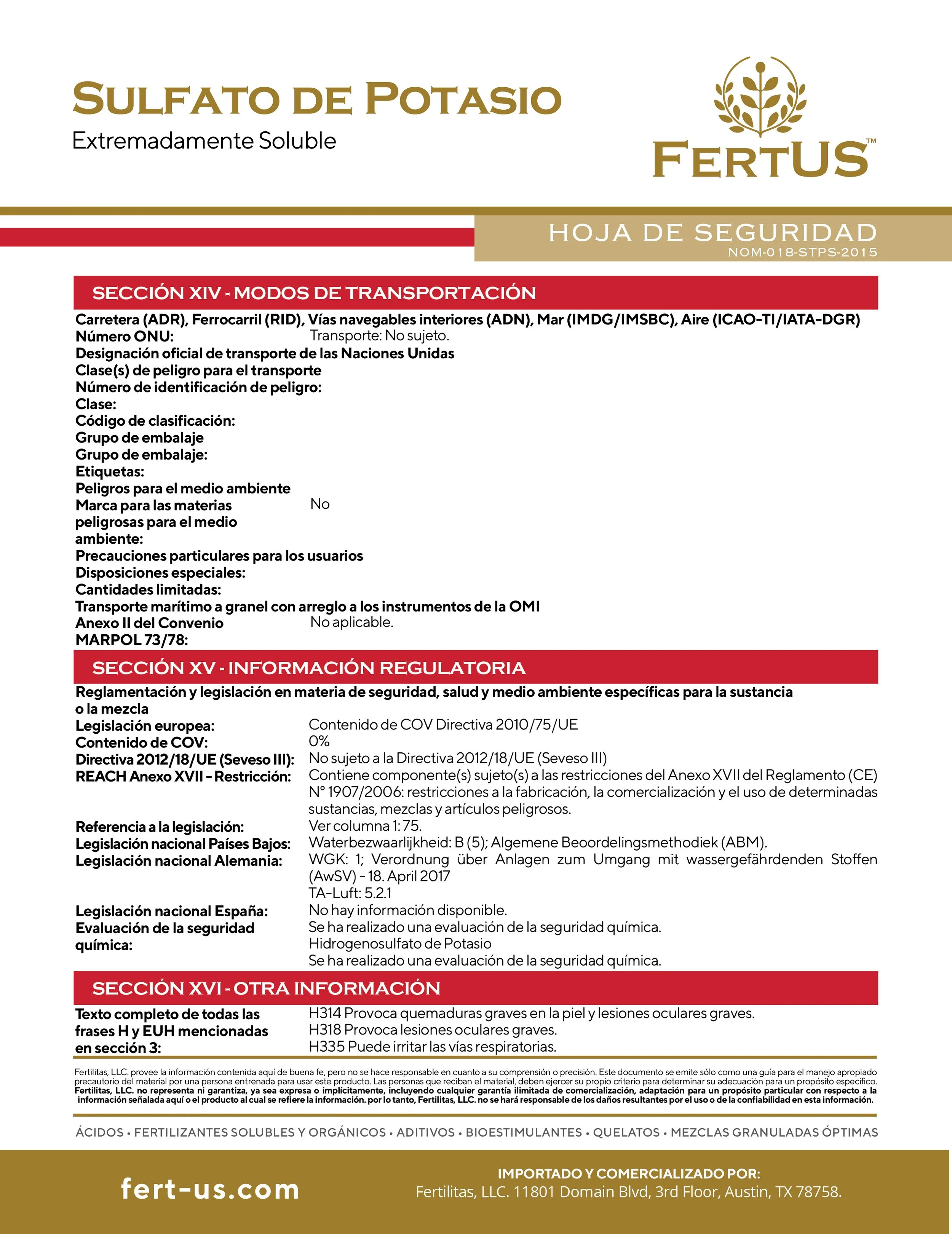 Extremandamente Soluble. 25 % más soluble que un sulfato de potasio tradicional. Sulfato de potasio envasado en origen lo cual asegura la máxima limpieza. Sulfato de potasio con el pH más bajo 2.0. Se disuelve en la mitad del tiempo que se disuelve un sulfato de potasio tradicional. Tiene sólo un 0.03% de insolubles que equivale al 25% del total de insolubles que tiene un sulfato de potasio tradicional. Todas las características de solucros permiten elaborar una la solución nutritiva de mejor calidad. PRESENTACIÓN: Granulos de gran solubilidad envasados en sacos de 25 kg con bolsa interna.